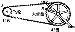 2、选择题  图示为某品牌自行车的部分结构.A、B分别是飞轮边缘、大齿盘边缘上的点.飞轮14齿,大齿盘42齿.现在提起自行车后轮,转动脚蹬,使大齿盘和飞轮转动,则下列说法正确的是(  )