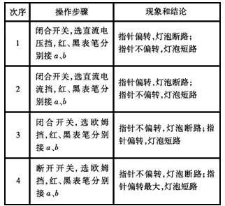 3、选择题 在如图所示的电路中,闭合开关时,小灯泡不亮,已经确定是小灯泡断路或短路引起的,在不能拆开电路的情况下(开关可闭合,可断开),现用一个多用电表的直流电压挡、直流电流挡和欧姆挡分别对故障电路进行了如下检查并作出判断(如下表所示):
