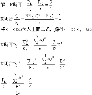 ,当电键K打开时,电源的内、外电路消耗功率之比为1:3;当电键K闭合时,内、外电路消耗功率之比为1:1.求电键K闭合前后灯泡L消耗功率的比值.