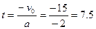 初速度v0=15m/s,a = -2m/s2,分析知车运动 7 .5s就会停下,在后 2 .5s内,车停止不动。