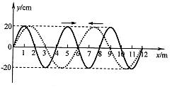 2、填空题 (6分)两列简谐横波的振幅都是20 cm,传播速度大小相同。实线波的频率为2 Hz,沿x轴正方向传播;虚线波沿x轴负方向传播。某时刻两列波在如图所示区域相遇。则该时刻在x ="0--12" m范围内,速度最大的是平衡位置为x=?m的质点;?从图示时刻起再经过1.5 s,平衡位置为x="6" m处的质点的位移y=?m。