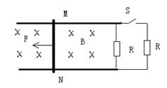 5、选择题   如图所示平行的金属双轨与电路处在竖直向下的匀强磁场B中,一金属杆放在金属双轨上在恒定外力F作用下做匀速运动,则在开关S?