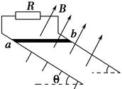 1、计算题  如图所示.光滑的平行金属导轨长为L、间距为d,轨道平面与水平面的夹角为θ,导轨上端接一阻值为R的电阻,导轨所在空间有垂直导轨平面向上的匀强磁场,磁场的磁感应强度为B.有一质量为m、电阻为r的金属棒ab,放在导轨最上端,其余部分电阻不计.已知棒ab从导轨最上端由静止开始下滑到最底端的过程中,整个电路中产生的热量为Q,重力加速度为 g,求: