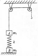 2、计算题 (9分)如图,质量为2m 的物体A经一轻质弹簧与下方地面上的质量为3m 的物体B相连,弹簧的劲度系数为k,A、B都处于静止状态.一条不可伸长的轻绳绕过定滑轮,一端连物体A,另一端连一轻挂钩.开始时各段绳都处于伸直状态,A上方的一段绳沿竖直方向.现在挂钩上挂一质量为2.5m 的物体C并从静止状态释放,已知它恰好能使B离开地面但不继续上升,已知重力加速度为g.试求