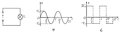 5、选择题 先后用不同的交流电源给同一盏灯泡供电。第一次灯泡两端的电压随时间按正弦规律变化(如图甲所示);第二次灯泡两端的电压变化规律如图乙所示。若甲、乙图中的U0、T所表示的电压、周期值是相同的,则以下说法正确的是