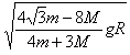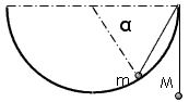 4、填空题 如图所示,在一个半径为R的半圆形光滑固定的轨道边缘,装着一个定滑轮,一轻绳跨过定滑轮,两端系着质量分别为m和M的物体(m>2M),现将m从静止开始释放,m从轨道上边缘滑到此位置(α=60°)时的速率是______________。