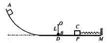 1、计算题 如图所示,竖直放置的圆弧轨道和水平轨道两部分相连。水平轨道的右侧有一质量为2m的滑块C与轻质弹簧的一端相连,弹簧的另一端固定在竖直的墙M上,弹簧处于原长时,滑块C静止在P点处;在水平轨道上方O处,用长为L的细线悬挂一质量为m的小球B,B球恰好与水平轨道相切,并可绕O点在竖直平面内摆动。质量为m的滑块A由圆弧轨道上静止释放,进入水平轨道与小球B发生碰撞,A、B碰撞前后速度发生交换。P点左方的轨道光滑、右方粗糙,滑块A、C与PM段的动摩擦因数均为μ=0.5,A、B、C均可视为质点,重力加速度为g。