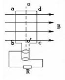 4、计算题  (10分)如图所示,ab=25cm,ad=20cm,匝数为50匝的矩形线圈。线圈总电阻 r=1Ω外 电路电阻R ="9Ω" 。磁感应强度B=0.4T。线圈绕垂直于磁感线的OO’ 轴以角速度50rad/s匀速转动。求:
