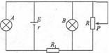 2、选择题   如图所示电路中.A、B两灯均正常发光,R为一滑动变阻器,P为滑动片,若将滑动片向下滑动,则(        )