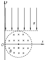 1、计算题  如图所示,在xoy坐标系中,以(r,0)为圆心、r为半径的圆形区域内存在匀强磁场,磁场的磁感应强度大小为B,方向垂直于纸面向里。在y>r的足够大的区域内,存在沿y轴负方向的匀强电场,场强大小为E。从O点以相同速率向不同方向发射质子,质子的运动轨迹均在纸面内,且质子在磁场中运动的轨迹半径也为r。已知质子的电荷量为q,质量为m,不计质子所受重力及质子间相互作用力的影响。
