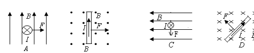 3、选择题 如下图所示的均匀磁场中,已经标出了电流I和磁场B以及磁场对电流作用力F三者其方向,其中错误的是( )