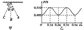 4、计算题 将一测力传感器连接到计算机上就可以测量快速变化的力,如图甲中O点为单摆的固定悬点,现将小摆球(可视为质点)拉至A点,此时细线处于张紧状态,释放摆球,则摆球将在竖直平面内A、B、C之间来回摆动,其中B点为运动中的最低位置,∠COB=θ,θ小于5°且未知。图乙表示由计算机得到的细线对摆球的拉力大小F随时间t变化的曲线,且图中t=0时刻为摆球从A点开始运动的时刻,试根据力学规律和题中(包括图中)所给的信息求:(g取10 m/S2)