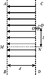 1、计算题  (8分)如图所示,相距为d的虚线AB、CD之间存在着水平向左的、场强为E的匀强电场,M、N是平行于电场线的一条直线上的两点,紧靠CD边界的右侧有一O点,与N点相距为l,在O点固定一电荷量为(k为静电力常量)的正点电荷,点电荷产生的电场只存在于CD边界的右侧。今在M点释放一个质量为m、电量为-e的电子(重力不计)。求: