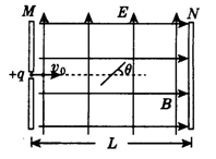2、选择题  如图所示,m=2.00×10-10kg的小球(可看成质点),带电量q=+8.00×10-8C,以初速度v0=1.00×102m/s从A点进入足够大的M、N板之间的区域,M、N间距离L=2.00m,电场强度E=2.50×10-2N/C,方向竖直向上,磁感应强度B=0.250T,方向水平向右。在小球运动的正前方固定一个与水平方向成θ=45°足够小的绝缘薄板,假设小球与薄板碰撞时无机械能损失,取g=10m/s2则? (? )