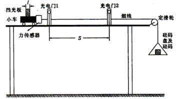 (2)实验获得以下测量数据:小车、传感器和挡光板的总质量M,挡光板的宽度l,光电门1和2的中心距离为s。某次实验过程:力传感器的读数为F,小车通过光电门1和2的当光时间分别为t1、t2(小车通过光电门2后,砝码盘才落地),已知重力加速度为g,则该实验要验证的式子是____________。