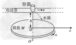 4、计算题  如图所示,M是水平放置的半径足够大的圆盘,绕过其圆心的竖直轴OO′匀角速转动,规定经过O水平向右为x轴的正方向.在圆心O正上方距盘面高为h处有一个正在间断滴水的容器,从t=0时刻开始随传送带沿与x轴平行的方向做匀速直线运动,速度大小为v。已知容器在t=0时刻滴下第一滴水,以后每当前一滴水刚好落到盘面上时再滴一滴水.求: