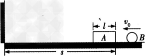 如图所示,质量为m的木块A放在光滑的水平面上,木块的长度为l,另一个质量为M=3m的小球B以速度v0在水平面上向左运动并与A在距竖直墙壁为s处发生碰撞,已知碰后木块A的速度大小为v0,木块A与墙壁的碰撞过程中无机械能损失,且碰撞时间极短,小球的半径可忽略不计。求木块和小球发生第二次碰撞时,小球到墙壁的距离。