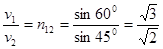 2、选择题 如图是一列机械波从一种介质进入另一种介质中发生的现象,已知波在介质Ⅰ中的波速为v1,波在介质Ⅱ中的波速为v2,则v1∶v2为( )
