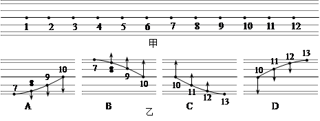 1、选择题 如图甲中有一条均匀的弹性绳,1、2、3………是绳上一系列等间距的质点,相邻质点间距为1m,当t=0时,质点1开始向上运动经0.1s到达最大位移此时波传播到第4个质点。再经过0.2s,弹性绳上相邻质点的位置和振动方向如图乙所示(只画出其中一段绳上相邻四个质点的运动情况,余未画出),其中正确的图是( ?)