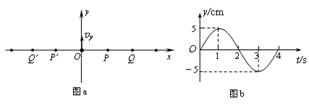 5、选择题 如图 (a)所示,一根水平张紧的弹性长绳上有等间距的Q′、P′、O、P、Q质点,相邻两质点间距离为1 m.t=0时刻O质点从平衡位置开始沿y轴正方向振动,并产生分别向左、向右传播的波,O质点振动图像如图 (b)所示,当O点第一次达到正方向最大位移的时刻,P点刚开始振动,则( )