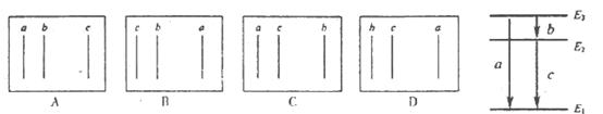 5、选择题 如图所示为氢原子的能级图,a、b、c为氢原子跃迁时可能发出的三种波长的光,在下列氢原子光谱的各选项中,谱线从左向右的波长依次增大,则正确的是