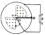 3、选择题 如图所示,一导体圆环位于纸面内,O为圆心。环内两个圆心角为90°的扇形区域内分别有匀强磁场,两磁场磁感应强度的大小相等,方向相反且均与纸面垂直。导体杆OM可绕O转动,M端通过滑动触点与圆环良好接触。在圆心和圆环间连有电阻R。杆OM以匀角速度ω逆时针转动,t=0时恰好在图示位置。规定从a到b流经电阻R的电流方向为正,圆环和导体杆的电阻忽略不计,则杆从t=0开始转动一周的过程中,电流随ωt变化的图象是