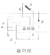 4、计算题 (16分)法拉第曾提出一种利用河流发电的设想,并进行了实验研究,实验装置的示意图可用题23图表示,两块面积均为S的举行金属板,平行、正对、数值地全部浸在河水中,间距为d。水流速度处处相同,大小为v,方向水平,金属板与水流方向平行。地磁场磁感应强度的竖直分别为B,说的电阻率为p,水面上方有一阻值为R的电阻通过绝缘导线和电键K连接到两个金属板上,忽略边缘效应,求: