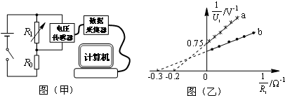 4、简答题 干电池用久后通常电动势会减小,内阻增大.某同学利用DIS系统、定值电阻R0、电阻箱R1等实验器材分别研究新、旧两节干电池的电动势和内阻,实验装置如图(甲)所示.实验时多次改变R1的阻值,用电压传感器测得R1上的电压U1,在计算机上显示出如图(乙)所示的