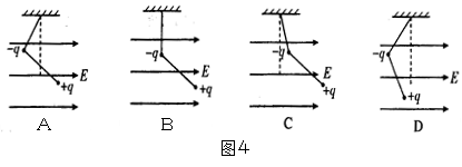 1、选择题 如下图所示,甲、乙两带电小球的质量为m,所带电量分别为+q和一q,两球间用绝缘细线连接,甲球又用绝缘细线悬挂在天花板上,在两球所在空间有方向向右的匀强电场,电场强度为E,平衡时细线被拉紧。则当两小球均处于平衡时的可能位置是( )?
