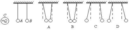 2、选择题 如图所示,A、B为两个用绝缘细丝线悬挂起来的质量相同的带电小球,左边放一个带正电的球C时,两悬线都保持竖直方向(两线长度相同),若把C球移走,下面哪个图可以表示A、B两球的位置? ( A、B没接触) ( )