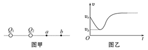 4、选择题 如图甲所示,Q1、Q2为两个被固定的点电荷,其中Q1带负电,a、b两点在它们连线的延长线上.现有一带负电的粒子以一定的初速度沿直线从a点开始经b点向远处运动(粒子只受电场力作用),粒子经过a、b两点时的速度分别为va、vb,其速度图象如图乙所示,以下说法中正确的是