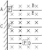 4、选择题 如图,在水平向左的匀强电场和垂纸面向里的匀强磁场中,E=4V/m,B=2T,一质量为m=1.0×l0-3kg的带正电的小物块P带电量q=2.5×10-3C,从绝缘粗糙的竖直墙壁的A点无初速下滑,物体与墙壁间动摩擦因数μ=0.5,当它向下滑行h=0.8m到达C点时,离开墙壁做曲线运动,当它运动到与墙的水平距离为0.6m时,竖直方向下落的高度即D与A的高度差H=1.6m.(g=l0m/s2)
