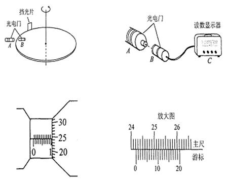 2、简答题 一水平放置的圆盘绕过其圆心的竖直轴匀速转动。盘边缘上固定一竖直的挡光片。盘转动时挡光片从一光电数字计时器的光电门的狭缝中经过,如图a所示。图b为光电数字计时器的示意图。光源A中射出的光可照到B中的接收器上。若A、B间的光路被遮断,显示器C上可显示出光线被遮住的时间。挡光片的宽度用螺旋测微器测得,结果如图c所示。圆盘直径用游标卡尺测得,结果如图d所示。由图可知,