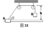 3、简答题 如图13所示,跨过同一高度处的光滑滑轮的细线连接着质量相同的物体A和B。A套在光滑水平杆上,定滑轮离水平杆高度为h=0.2m,开始让连接A的细线与水平杆夹角θ=53°,由静止释放,求在以后的过程中A所能获得的最大速度。