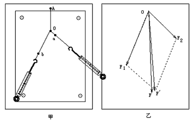 1、实验题 如图甲所示,在“验证力的平行四边形定则”的实验中,某同学进行实验的主要步骤是:将橡皮筋的一端固定在木板上的A点,另一端拴上两根绳套,每根绳套分别挂着一个弹簧测力计,沿着两个方向拉弹簧测力计,将橡皮筋的活动端拉到某一位置,将此位置标记为O点,读取此时弹簧测力计的示数,分别记录两个拉力F1、F2的大小。再用笔在两绳的拉力方向上分别标记a、b两点,并分别将其与O点相连,表示两拉力的方向。再用一个弹簧测力计将橡皮筋的活动端仍拉至O点,记录其拉力F的大小并用上述方法记录其方向。