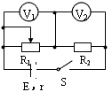 2、选择题  如图所示电路中,电源电动势E,内阻r。闭合开关S,当R1的滑动触头向右移动时,电压表V1的示数变化ΔU1,电压表V2的示数变化ΔU2,ΔU1、ΔU2均为其变化的绝对值,则