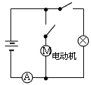 4、选择题  汽车电动机启动时车灯会瞬时变暗,如图,在打开车灯的情况下,电动机未启动时电流表读数为10 A,电动机启动时电流表读数为58 A,若电源电动势为12.5 V,内阻为0.05 Ω,电流表内阻不计,则因电动机启动,车灯的电功率降低了
