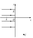 4、计算题 )如图为一用来使带正电的离子加速和偏转装置的等效模型图。以y轴为界,左侧为沿x轴正向的匀强电场,场强大小为E。装置要求使质量为m,电量为q,初速度为0的正离子(不计重力)从A点释放后,其运动轨迹刚好通过C点,已知A点坐标为(-L,0),C点坐标为(L,-2L)。