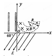 1、计算题 (22分)如图所示,平面直角坐标系xoy中,在第二象限内有竖直放置的两平行金属板,其中右板开有小孔;在第一象限内存在内、外半径分别为、R的半圆形区域,其圆心与小孔的连线与x轴平行,该区域内有磁感应强度为B的匀强磁场,磁场的方向垂直纸面向里:在y<0区域内有电场强度为E的匀强电场,方向与x轴负方向的夹角为60°。一个质量为m,带电量为-q的粒子(不计重力),从左金属板由静止开始经过加速后,进入第一象限的匀强磁场。求: