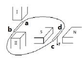 4、填空题 如图所示,Ⅰ和Ⅱ是一对异名磁极,ab为放在其间的金属棒。 ab 和cd用导线连成一个闭合回路。当ab棒向左运动时,cd导线受到向下的磁场力。由此可知Ⅰ是?极, a点电势?(填“大于”或“小于”)b点电势。
