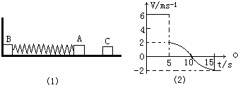 3、简答题 如图(1)所示,物体A、B的质量分别是4kg和8kg,由轻弹簧连接,放在光滑的水平面上,物体B左则与竖直墙壁相接触.另有一个物体C水平向左运动,在t=5s时与物体A相碰,并立即与A有相同的速度,一起向左运动,物块C的速度一时间图象如图(2)所示.