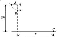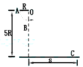 2、计算题 如图所示,一对杂技演员(都视为质点)乘秋千(秋千绳处于水平位置)从A点由静止出发绕O点下摆,当摆到最低点B时,女演员在极短时间内将男演员沿水平方向推出,然后自己刚好能回到高处A。求男演员落地点C与O点的水平距离s。已知男演员质量m1和女演员质量m2之比m1/m2=2,秋千的质量不计,秋千的摆长为R,C点比A点低5R。
