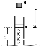 1、计算题 如图有一个竖直固定在地面的透气圆筒,筒中有一劲度系数为k的轻弹簧,其下端固定,上端连接一质量为m的薄滑块,圆筒内壁涂有一层新型智能材料——ER流体,它对滑块的阻力可调。起初,滑块静止,ER流体对其阻力为0,弹簧的长度为L,现有一质量为M=2m的物体从距地面2L处自由落下,与滑块瞬间碰撞后粘在一起向下运动。为保证滑块做匀减速运动,且下移距离为(g为重力加速度)时速度减为0,ER流体对滑块的阻力须随滑块下移而变。试求(忽略空气阻力):