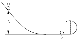 2、计算题 如图所示,一水平轨道左端与一倾斜轨道平滑连接,右端与一半径为R的竖直面内的圆轨道连接,小球B静止在水平轨道上,小球A从倾斜轨道上某高度处由静止开始下滑,与B发生无能量损失的弹性正碰,不计一切摩擦,已知A、B的质量分别为mA=m,mB=3m,若碰后小球B恰好能通过圆轨道的最高点,求释放小球A的初始位置距离水平轨道的高度h。