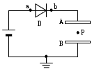 5、选择题  D是一只理想二极管(a正极:电流只能从a流向b,而不能从b流向a)。平行板电容器A、B两极板间有一电荷在P点处于静止,以E表示两极板间电场强度,U表示两极板间电压,EP表示电荷在P点电势能。若保持极板B不动,将极板A稍向上平移,则