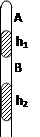 2、填空题 如图,开口向下、粗细均匀的玻璃管中,用长度分别为h1=5cm和h2=8cm两段水银柱封闭了两段气体A和B,稳定后A、B体积相等。设定外界大气压恒为P0=75cmHg,则封闭气体A的压强为________ cmHg.若降低相同的温度(设原来温度相同),则A的体积VA_______VB.(填“>”, “<”或者“="”" )