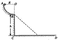 圆形轨道,竖直BC段高h=5m,CD段为水平轨道。一质量为0.1kg的小球由A点从静止开始下滑到B点时速度的大小为2m/s,离开B点后做平抛运动(g=10m/s2),求: