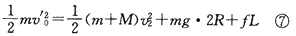 (3)设物块以初速度v"0上轨道,可以达到的最大高度为2R,物块从C点离开轨道,其水平方向的速度总与轨道速度相等,达到最高点时,物块水平方向跟轨道的速度相等设为v2,则有mv"0=(m+M)v2? ⑥