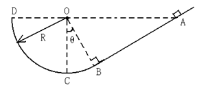 5、计算题 (9分)如图所示,竖直固定放置的斜面AB的下端与光滑的圆弧轨道BCD的B端相切,圆弧面的半径为R,圆心O与A、D在同一水平面上,∠COB=θ,现有一质量为m的小物体从斜面上的A点无初速滑下,已知小物体与AB斜面间的动摩擦因数为μ,重力加速度为g。求: