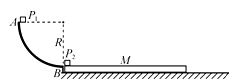 2、计算题 如图所示,水平地面上竖直固定一个光滑的、半径R=0.45m的1/4圆弧轨道,A、B分别是圆弧的端点,圆弧B点右侧是光滑的水平地面,地面上放着一块足够长的木板,木板的上表面与圆弧轨道的最低点B等高,可视为质点的小滑块P1和P2的质量均为m=0.20kg,木板的质量M=4m,P1和P2与木板上表面的动摩擦因数分别为